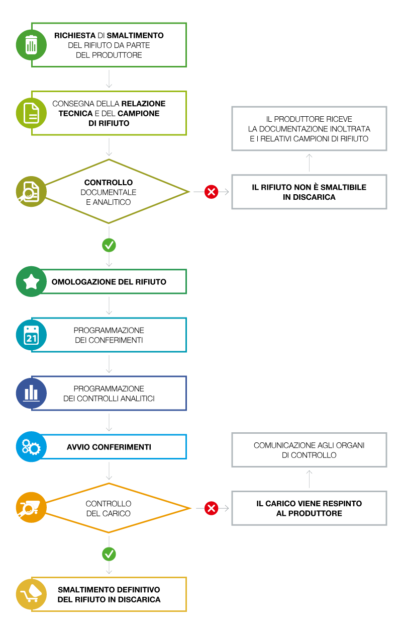 Il conferimento dei rifiuti all’impianto di Collegno è soggetto a un’accurata procedura di controllo. All’arrivo il rifiuto viene riconosciuto attraverso l’omologa (la “carta d’identità” di quel rifiuto) e la verifica a campione dei parametri chimici e fisici. Questo processo consente di controllare le informazioni circa le caratteristiche di ogni rifiuto conferito, in modo da confermare la sua corretta smaltibilità nel rispetto delle prescrizioni normative vigenti. Se l’iter di controllo ha dato esito positivo, il rifiuto viene conferito in discarica dopo l’attribuzione di un numero che lo certifica inmaniera univoca. In caso contrario, il carico viene rispedito al mittente, con relativa comunicazione all’Ente di controllo (Città Metropolitana di Torino).